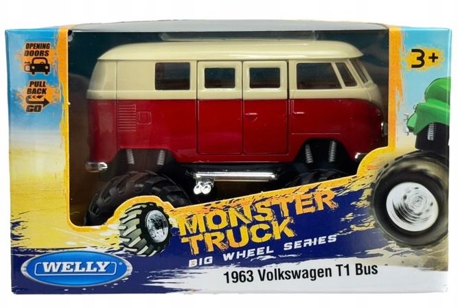 WELLY MONSTER TRUCK 1963 VW VOLKSWAGEN TRANSPORTER T1 BUS CZERWONY – Metalowy Model 1:34 z Napędem Pull&Go! 🔥