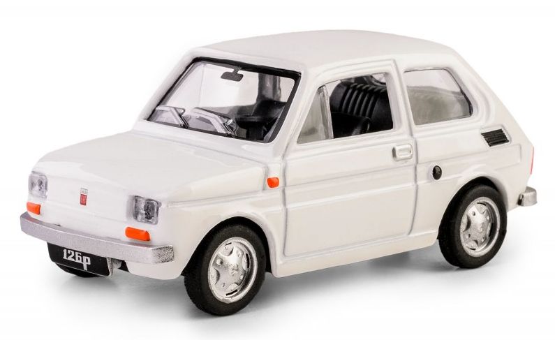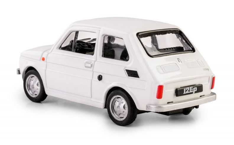 Model wiernie oddaje charakterystyczną sylwetkę Fiata 126p, detale nadwozia oraz realistycznie wykonane wnętrze. Klasyczny biały kolor doskonale nawiązuje do autentycznych wersji spotykanych na polskich ulicach w czasach PRL. Całość zapakowana jest w estetyczne kartonowe opakowanie z okienkiem, idealne zarówno do ekspozycji, jak i na prezent.