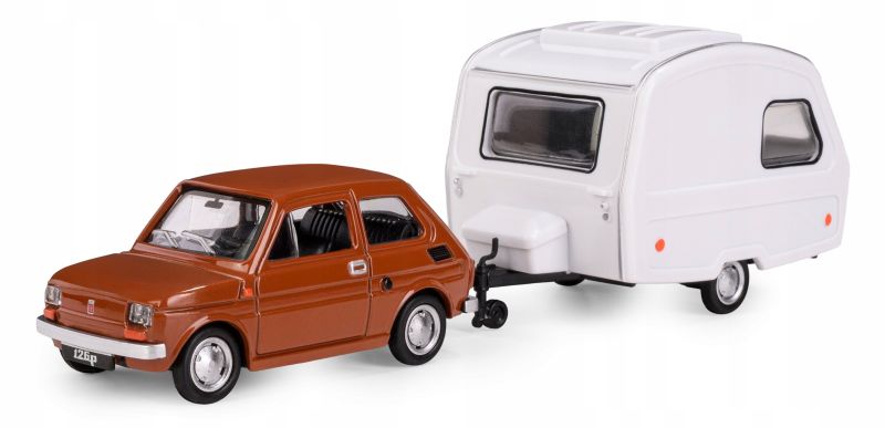 Miniatura przedstawia kultowego Małego Fiata wyposażonego w hak holowniczy, do którego dołączona jest legendarna przyczepa Niewiadów N126 – tzw. „Niewiadówka”. Model został wykonany z dużą dbałością o szczegóły – metalowe nadwozie samochodu, plastikowe elementy wykończeniowe oraz starannie odwzorowana przyczepa tworzą realistyczny zestaw kolekcjonerski.