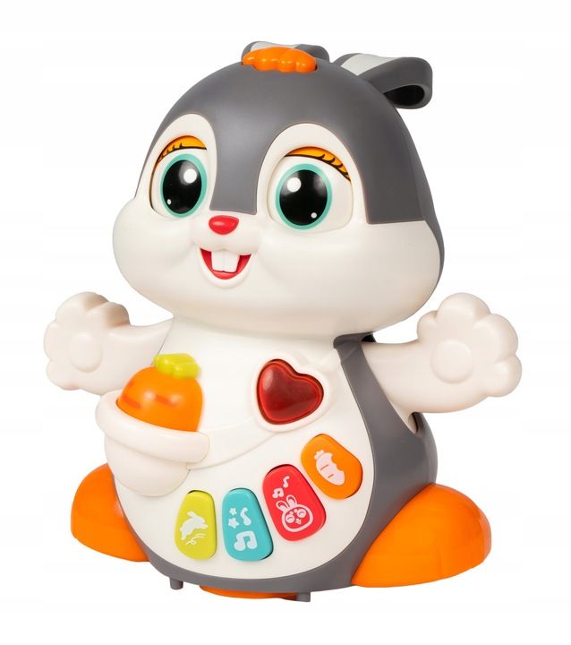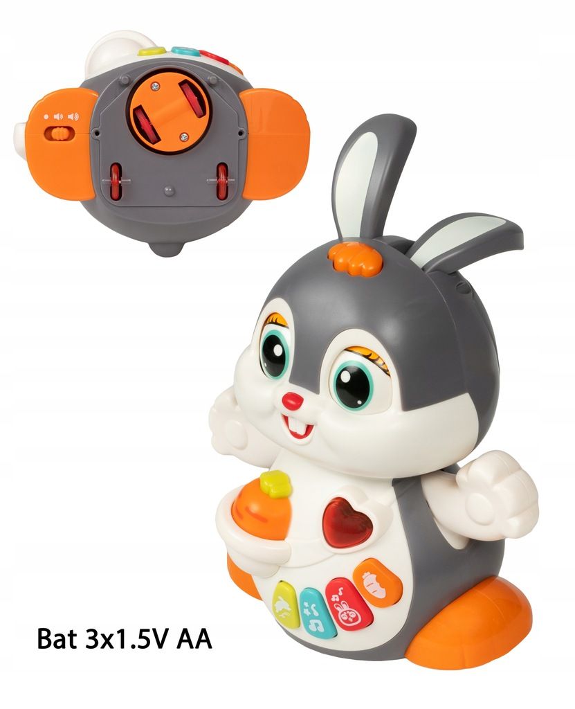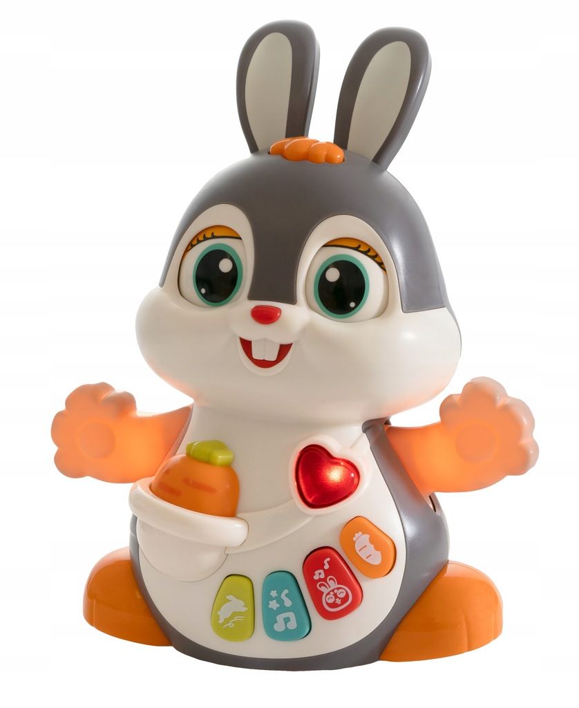 Na brzuszku królika znajdują się kolorowe przyciski funkcyjne, które uruchamiają różnorodne dźwięki, melodie i odgłosy. Zabawka posiada również regulację głośności, co zwiększa komfort użytkowania w domu.