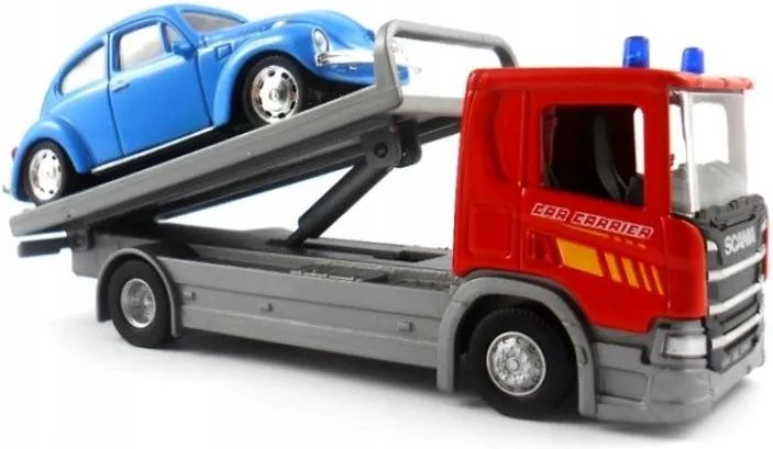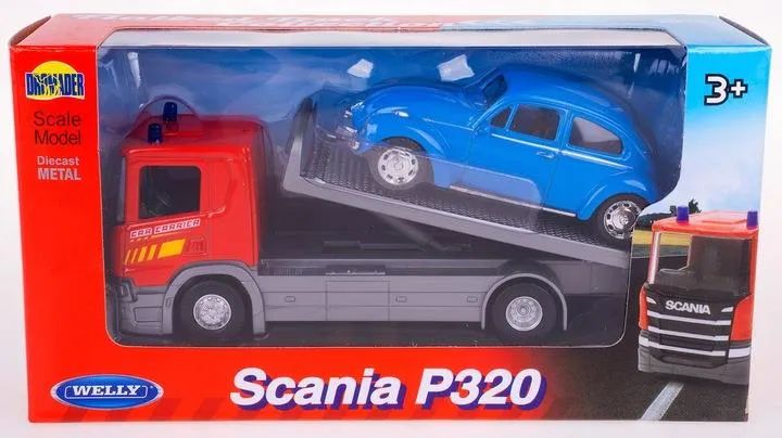 Metalowy samochód ciężarowy Scania P320 z lawetą renomowanej firmy WELLY to atrakcyjny zestaw, który łączy realistyczne wykonanie z dynamiczną zabawą. Czerwony tir wraz z lawetą ma około 17 cm długości i przewozi niebieski samochód Garbus o długości ok. 10 cm, tworząc komplet gotowy do zabawy lub ekspozycji kolekcjonerskiej.
