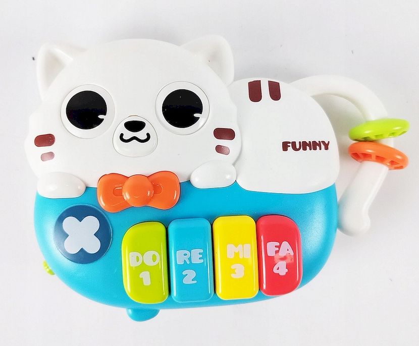 Zabawka posiada wygodną rączkę, która pełni jednocześnie funkcję zabawnej grzechotki, dzięki czemu pianinko można łatwo zabrać ze sobą na spacer lub w podróż. Przyjemna, dziecięca kolorystyka oraz estetyczne wykonanie sprawiają, że kotek szybko staje się ulubioną zabawką malucha.