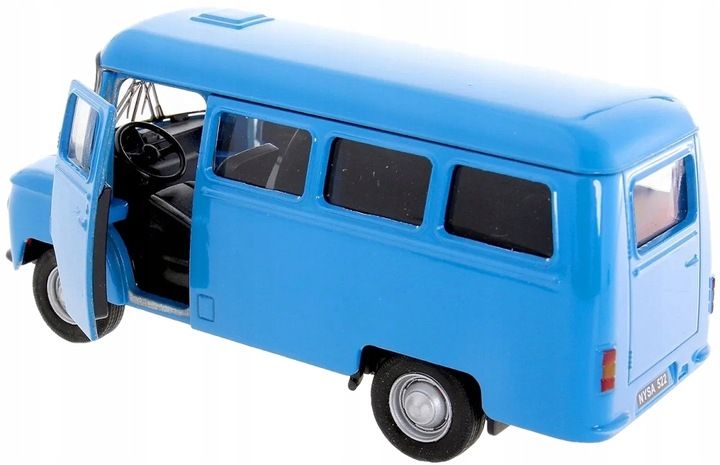 Miniatura posiada otwierane drzwi, a karoseria została pokryta oryginalnym lakierem samochodowym, co nadaje jej realistyczny wygląd i estetyczne wykończenie. Klasyczny niebieski kolor podkreśla historyczny charakter pojazdu i czyni model atrakcyjnym elementem każdej kolekcji.