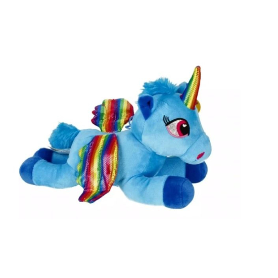 Szukasz wyjątkowego prezentu, który oczaruje każde dziecko? Ten pluszowy jednorożec w kolorze niebieskim z mieniącym się rogiem i tęczowymi skrzydłami to idealny towarzysz do zabawy i snu! Wykonany z miękkiego, przyjemnego w dotyku materiału, ma aż 32 cm długości i przyciąga wzrok kolorowymi detalami.