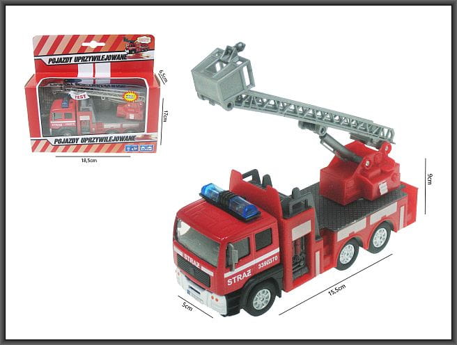 Samochód metalowy straż pożarna dla chłopców posiada około 14 cm długości i wysuwaną drabinę