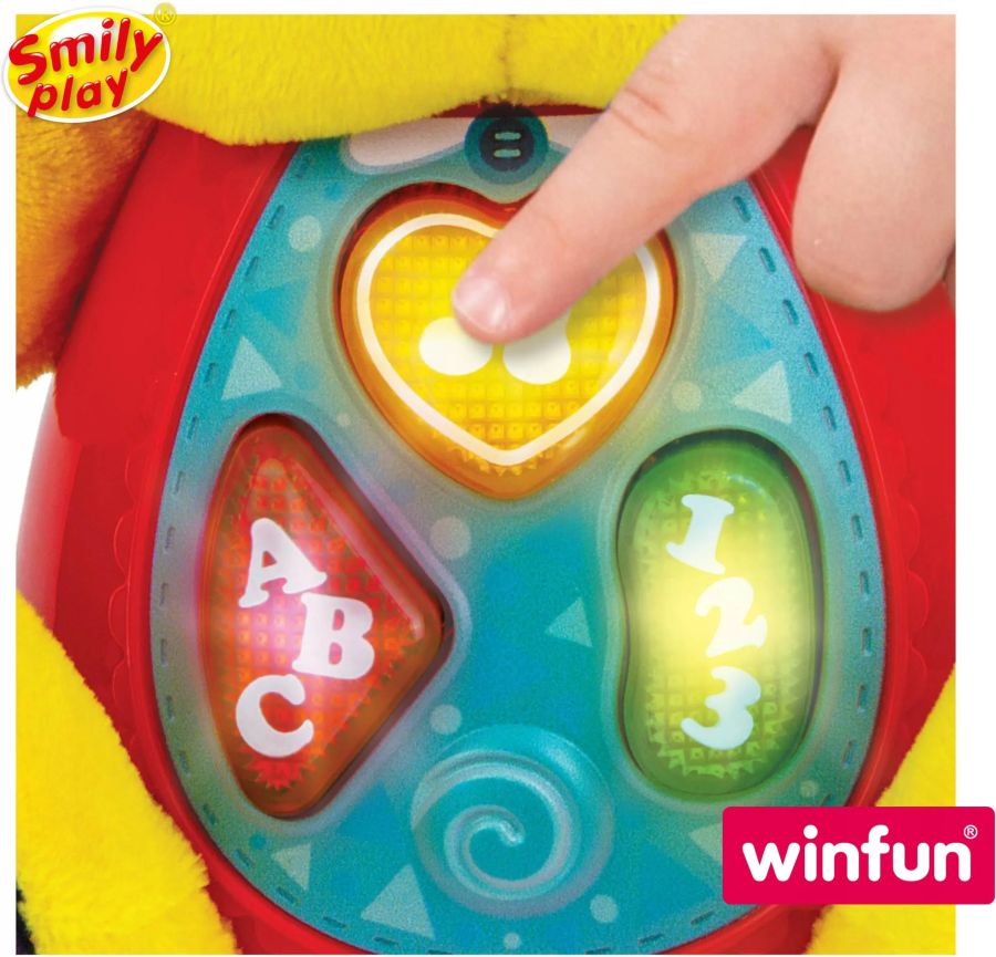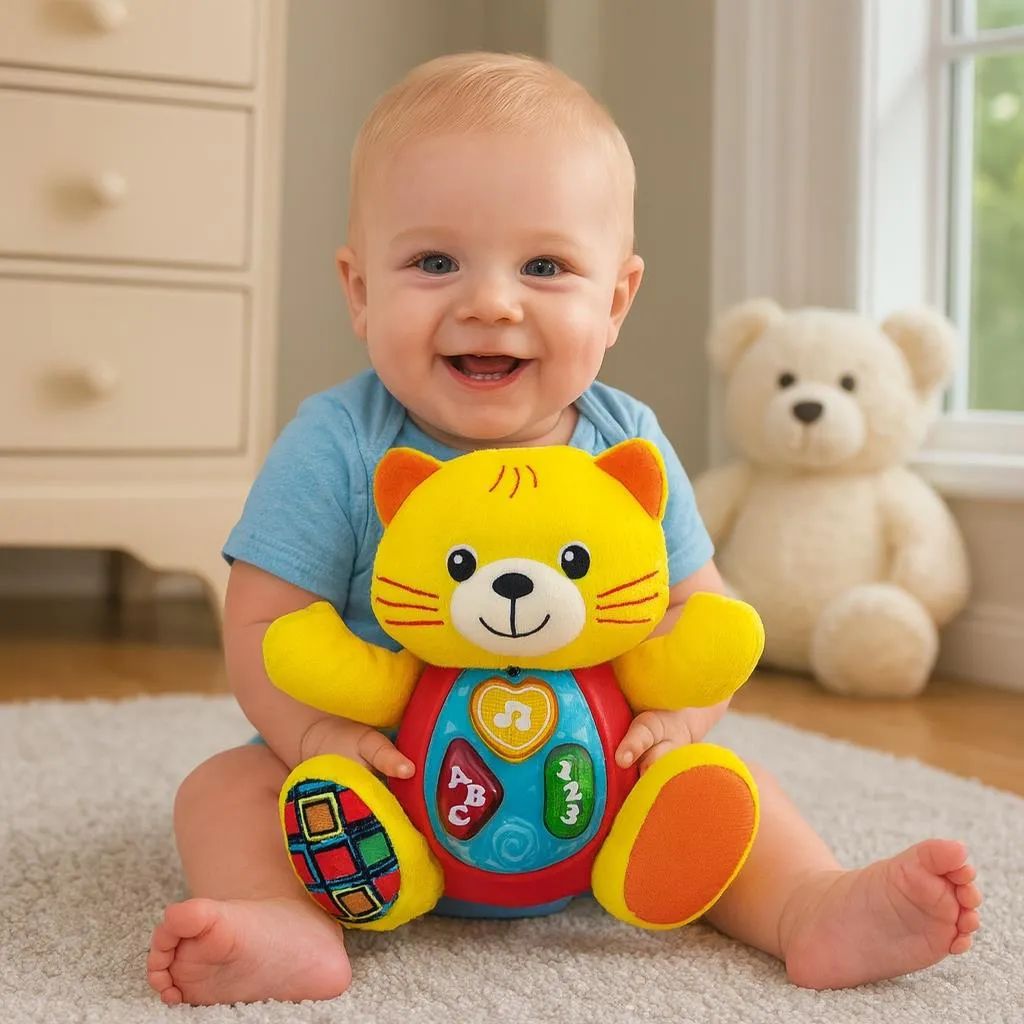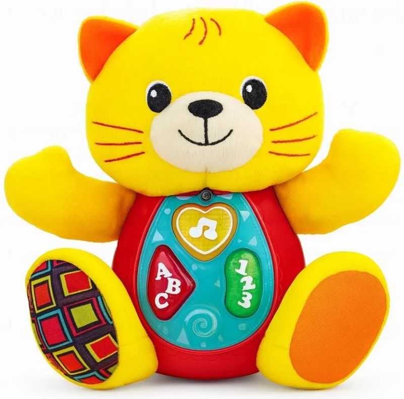 Kotek wyposażony jest w dwa świecące przyciski na brzuszku, które po naciśnięciu uruchamiają wesołe dźwięki i melodie. Dzięki nim dziecko może poznawać podstawowe litery i cyfry, ucząc się poprzez zabawę. Efekty dźwiękowe i świetlne skutecznie przyciągają uwagę malucha i zachęcają do interakcji.