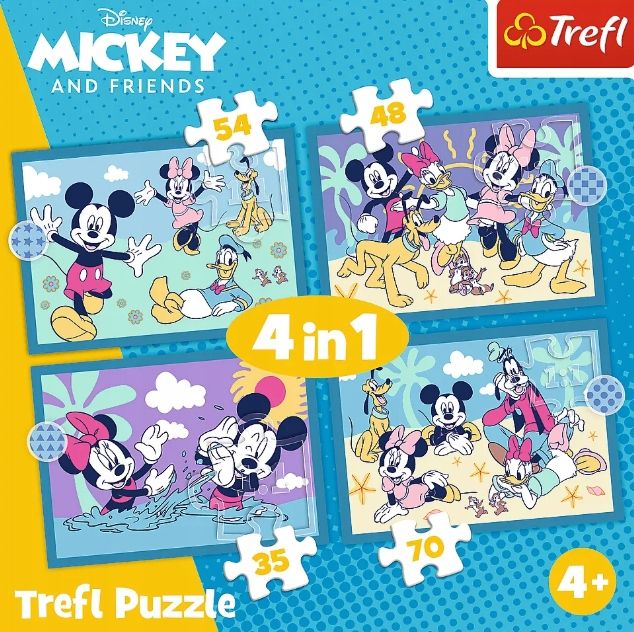 Puzzle 4w1 „Zabawne zdarzenia Myszki Miki” od Trefl to zestaw czterech niezależnych układanek stworzony dla małych fanów świata Disney Mickey and Friends. W jednym pudełku dziecko znajdzie aż 4 różne obrazki z Mikim i przyjaciółmi, które zapewniają urozmaiconą zabawę i zachęcają do powrotu do układania.