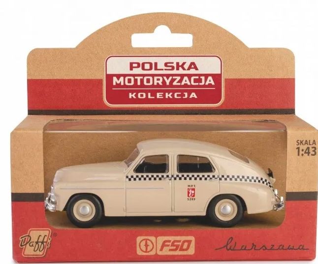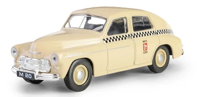 Prezentowana miniatura w skali 1:43 została wykonana w technologii die-cast z metalu z dodatkiem elementów z tworzywa sztucznego. Model zachwyca precyzją wykonania – wiernie odwzorowana masywna sylwetka, chromowane detale karoserii oraz realistyczne wnętrze oddają charakter kultowej Warszawy M20. Klasyczny piaskowy kolor doskonale nawiązuje do historycznych wersji pojazdu z lat PRL.
