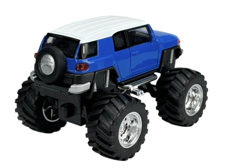 Samochód posiada napęd typu pull back (pociągnij i jedź), który umożliwia dynamiczną zabawę bez użycia baterii. Otwierane drzwi, amortyzowane zawieszenie oraz duże gumowe koła o średnicy ok. 4 cm nadają pojazdowi realistyczny, terenowy charakter. Intensywny niebieski kolor sprawia, że model wyróżnia się w kolekcji i przyciąga wzrok.