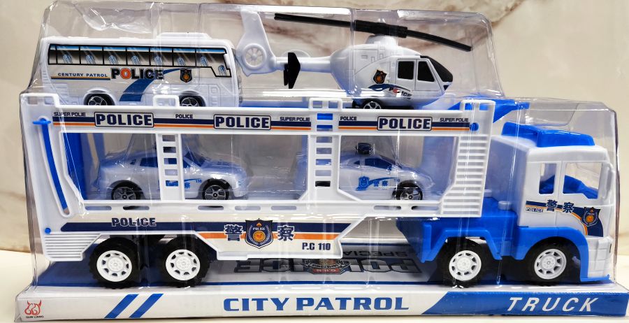 Samochód laweta Policja z czterema pojazdami policyjnymi to zabawka przeznaczona dla dzieci od lat 3.