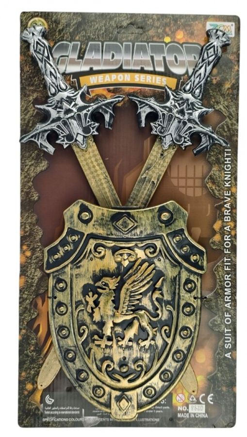 Zestaw został wykonany z lekkiego, ale solidnego tworzywa, dzięki czemu jest bezpieczny i wygodny w użytkowaniu przez dzieci. Bogate zdobienia, motyw herbu oraz metaliczna kolorystyka sprawiają, że zabawka przyciąga wzrok i zachęca do kreatywnej zabawy w rycerza, gladiatora lub strażnika zamku.
